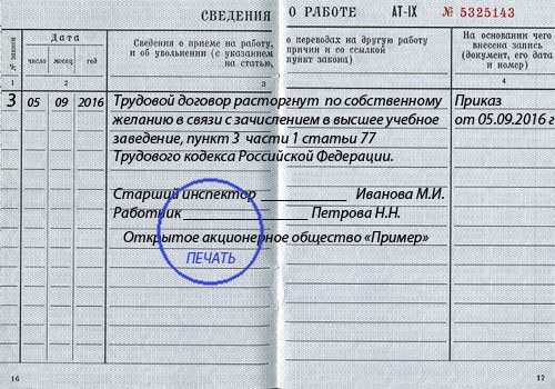 Увольнение по собственному желанию запись в трудовой образец 2016